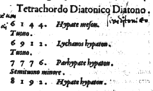30. Il Diatono era quello, che procedeua nelli suoi Tetrachordi per l’interuallo di vn minor Semituono, contenuto dalla proportione super 13. partiente 243. chiamato da i Greci apotomè; ancorache (come mostra Boetio) ogni spacio di Semituono chiamassero leimma, ouer diesis; & per due interualli di Sesquiottaua proportione, i quali nominarono Tuoni. Ist58 II, 16.