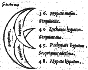 32. Il Sintono, ouero Incitato, che lo vogliamo dire, era quello, del quale il suo Tetrachordo procedeua dal graue uerso l’acuto per vno interuallo, contenuto tra la sua prima chorda graue, & la seconda, dalla Sesquiquintadecima proportione; & per vno di Sesquiottaua, posto tra la seconda & la terza, & per vno contenuto dalla Sesquinona, posto tra la terza & la quarta chorda acuta: Et per il contrario discendendo dall’acuto al graue, procedendo per gli istessi interualli; come si vede. Et questo è quello, che vsano i Moderni nelle loro Harmonie: conciosia che i termini delle sue proportioni sono collocati tra i Numeri Sonori, come nel cap. 15. della Prima parte si può vedere. Ist58 II,16.